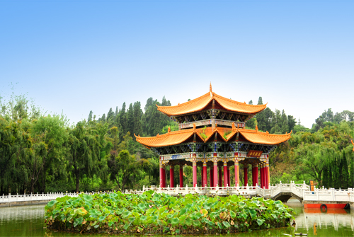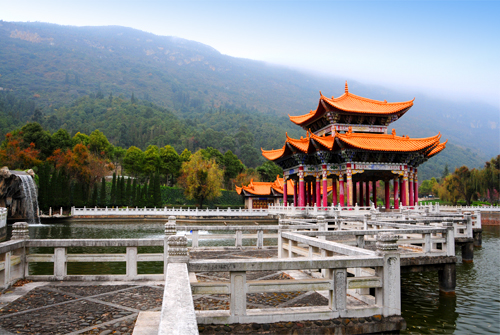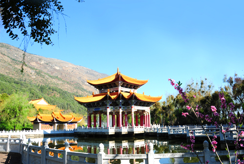 九曲回廊,映于湖水之中,一泓瀑布飛珠濺玉,清新濕潤的水氣淡淡飄來。雕梁畫棟的湖心亭和湖邊小榭,精巧雅致,是小憩、納涼、觀魚的好去處。