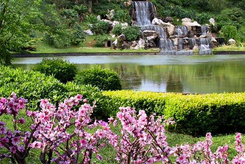 穿過柳綠,或沿池邊漫步,或在椅上小坐,看桃紅柳綠,聽鳥鳴瀑音,融于自然之中,歸入心靜之境,恍然有桃源勝境之感。