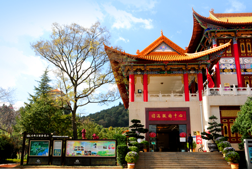 文化廣場(chǎng)以迎賓路為軸線展開,花壇排列,綠草如茵,鮮花四季盛開。氣勢(shì)恢宏的門坊上,中國書法家協(xié)會(huì)會(huì)長劉藝先生題寫的“金寶山藝術(shù)園林”貼金大字熠熠生輝。以門坊為前導(dǎo),鮮花副食店、佛事用品店、素食軒、園滿中心等明清風(fēng)格建筑群錯(cuò)落有致,營造出博大、典雅的氛圍。