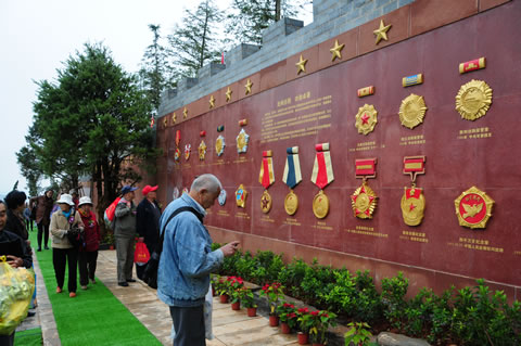 長220米、高6米的主景墻,由軍旗軍歌、功勛卓著、英雄雕塑和英雄墻四大板塊共同構成。“軍旗軍歌”是以軍旗浮雕為先導,以線描寫意的藝術手法勾勒出巍峨的群山和層疊的云海,一個解放軍號手傲然屹立吹奏著激昂的軍歌。“光輝歷程,功勛卓著”勛章墻,復制和展示出解放戰(zhàn)爭以來的26枚勛章和獎章。從解放東北、淮海戰(zhàn)役、渡江戰(zhàn)役到解放大西南,這些勛章獎章伴隨著解放大軍的征程,每一枚都承載著鮮活的真實故事,每一枚都因記錄光榮而煜煜生輝。