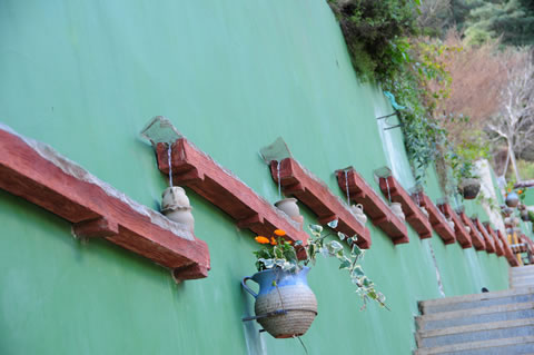 沿著石階緩步而上,我們能夠感受到這里有一種深居幽谷、門戶半開的意境,有幾分超脫紅塵的氛圍。在高低錯落的大小成臺前,橫向分布著一排排花池,用繽紛的花帶裝點出絢麗多彩。遠眺前方,山巒起伏,海闊天空,讓人心胸豁然開朗。
