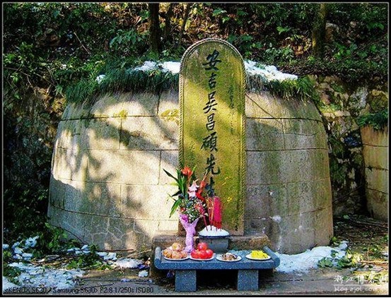 民國16年十一月(1927年11月6日),吳昌碩突患中風(fēng),十一月初六(1927年11月29日)病逝滬寓,享年84。先生生平酷愛梅花,常到超山探梅。1927年病故上海,遵其遺愿身后埋骨超山香雪塢,1932年移柩安葬超山大明堂西側(cè)。墓東立有章炳麟篆額、馮君木撰文、于右任書丹的吳昌碩先生墓表,墓左側(cè)為建于1986年的吳昌碩先生紀(jì)念館,墓門石柱上刻有沈淇泉(衛(wèi))所撰聯(lián)語:"其人為金石家,沉酣到三代鼎彝,兩京碑碣。此地傍玉潛故宅,環(huán)抱有幾重山色,十里梅花。吳昌碩墓1966年被破壞,1980年重建。墓朝東北向,高2米,直徑3米,墓碑由諸樂三題“安吉吳昌碩先生墓”。大明堂浮香閣藏有陳三立撰文、朱孝藏書丹、鄭孝胥書蓋的《安吉吳先生墓志銘》。1989年為浙江省重點保護(hù)文物。
